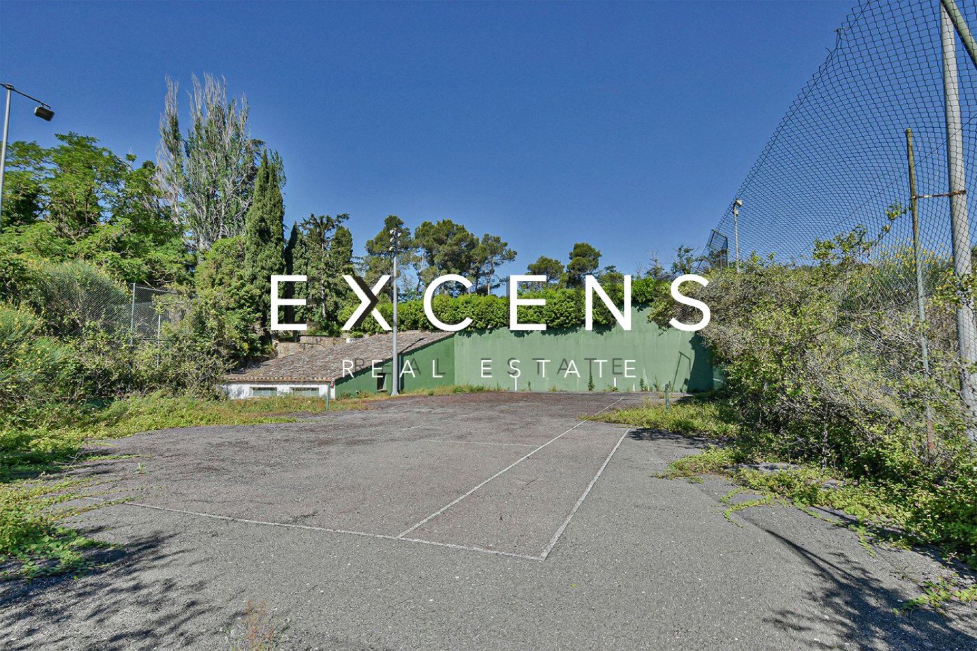 Tennis court and old squash court. Garage for 3 cars and covered parking for 2 cars. Workshop and storage.